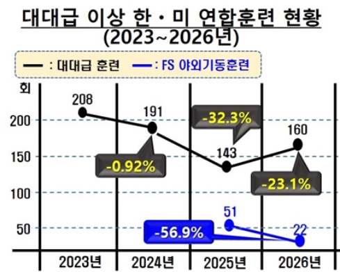 대한민국의 정치·사회적 혼란은 여전히 진행형이다. 대내·외 안보정세가 혼란스러운 가운데 한·미 간 여러 이견(異見)이 표출되고 있다. 굳건한 한미 동맹의 토대 위에서 정례적으로 진행하던 대대급 이상의 한·미 연합훈련 횟수는 줄어드는 추세다. 2023년 208회이던 훈련 횟수가 2024년엔 191회(-0.92%), 2025년엔 143회(-32.3%), 올해는 160회(-23.1%)로 확정됐다.