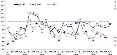 29일 광주상공회의소에 따르면 지역 제조업체 120곳을 대상으로 실시한 ‘2026년 1분기 기업경기실사지수(BSI)’ 조사 결과 지수는 89로 집계됐다. 전 분기(85)보다 4포인트(p) 상승했지만 기준치 100에는 미치지 못했다. BSI가 100 미만이면 다음 분기를 부정적으로 보는 기업이 더 많다는 의미다.