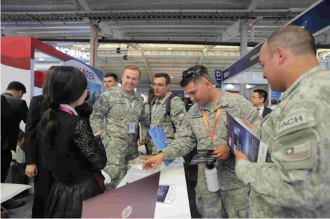 7일(현지시간) 칠레 산티아고에서 열린 중남미 최대 항공·방산 전시회인 'FIDAE 2026' 한국관을 찾은 칠레 국방부 및 군 주요 인사들이 국내 기업 전시 품목을 살펴보고 있다.