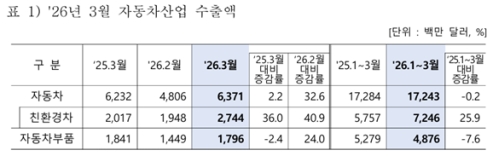 미국의 관세 부과와 중동전쟁에 따른 대외 불확실성 속에서도 지난 3월 한국 자동차 수출이 증가세를 이어갔다. 하이브리드차를 중심으로 한 친환경차 수출이 큰 폭으로 늘며 전체 실적을 견인했다.