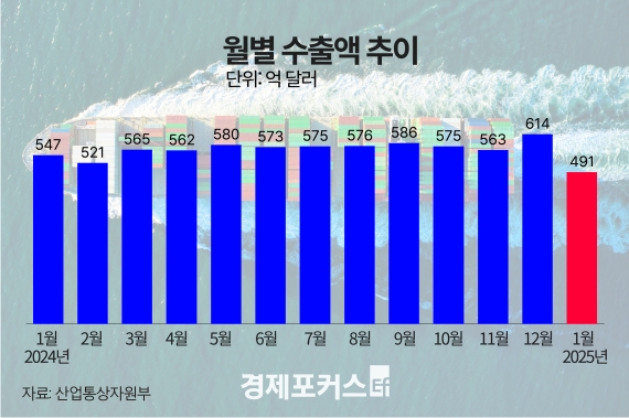 산업통상자원부는 1일 이 같은 내용의 1월 수출입 동향을 발표했다. 1월 수출액은 491억2000만 달러로 지난해 같은 달보다 10.3% 감소했다.
