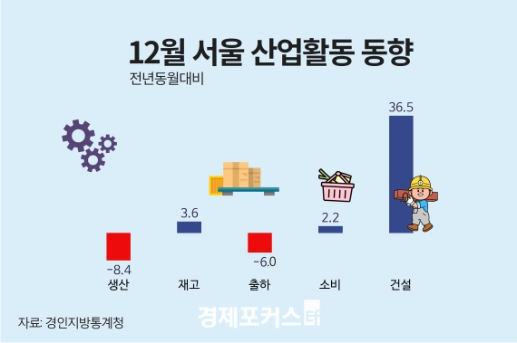 지난해 12월 서울 지역의 광공업 생산이 감소한 것으로 나타났다. 반면 대형소매점 판매액과 건설수주액은 증가하며 소비 및 건설경기가 다소 회복세를 보였다.
