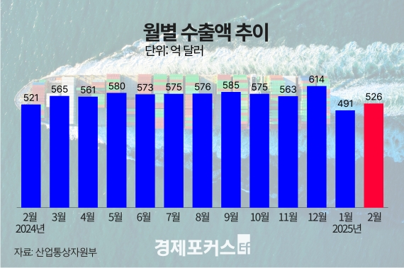 1일 산업통상자원부가 발표한 '2025년 2월 수출입동향'에 따르면 지난달 수출액은 526억 달러로 전년 동월 대비 1% 증가했다. 이는 역대 2월 기준 두 번째로 높은 실적이며, 1월 수출이 10.3% 감소했던 데서 한 달 만에 반등한 것이다.