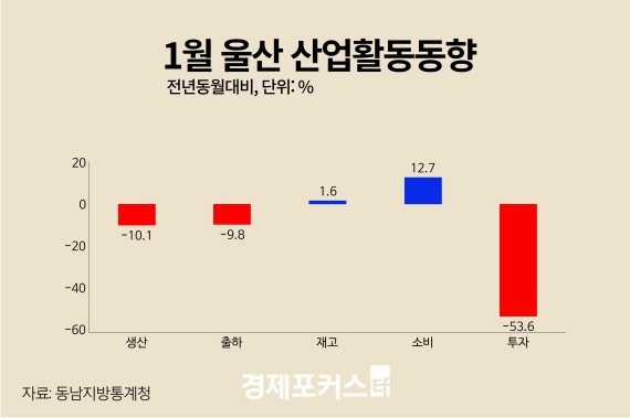 지난 1월 울산의 산업활동 동향을 분석한 결과 소비는 작년보다 증가했지만 생산과 건설수주는 줄어든 것으로 나타났다.