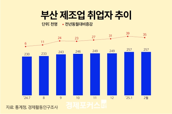 통계청이 발표한 ‘2025년 2월 부산시 고용동향’에 따르면, 부산의 제조업 취업자는 25만7000명으로 지난해 같은 달보다 3만5000명(15.7%) 증가했다. 전국적으로 제조업 취업자가 감소하는 흐름과 대조되는 모습이다.