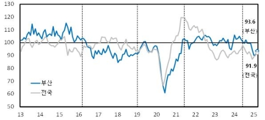 한국은행 부산본부가 26일 발표한 '2025년 3월 부산 지역 기업경기조사'에 따르면, 제조업 기업심리지수(CBSI)는 93.6으로 전월보다 3.1포인트 상승했으나 여전히 장기 평균(100)에는 미치지 못했다. 4월 전망치는 95.1로 예상됐다.