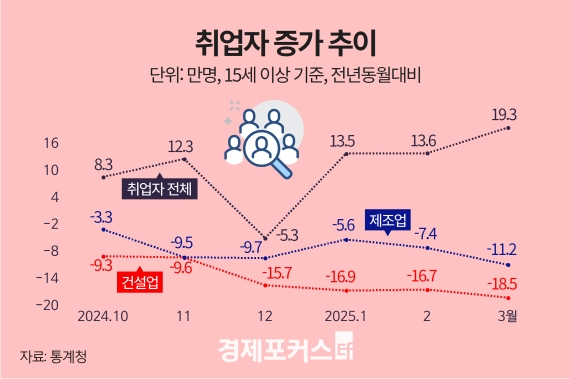 3월 취업자 수가 3개월 연속 10만 명대 증가세를 이어가며 전년 동기 대비 19만3천명 늘었지만, 건설업과 제조업 분야는 큰 폭의 고용 감소를 기록했다.