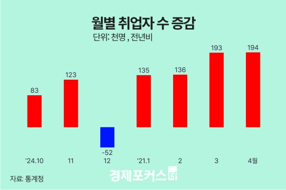 지난달 취업자 수는 전년 동월 대비 19만4000명 증가하며 넉 달 연속 증가세를 보였지만, 청년층 고용 부진과 제조업·건설업 일자리 감소가 지속되고 있다. 특히 제조업 취업자는 6년 2개월 만에 최대폭 감소한 것으로 나타났다.