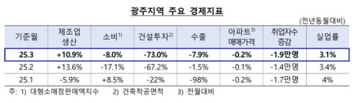지난 3월 광주·전남지역의 소비와 건설투자, 수출이 1년전보다 감소한 것으로 나타났다. 제조업 생산은 광주는 증가한 반면 전남은 감소했다.