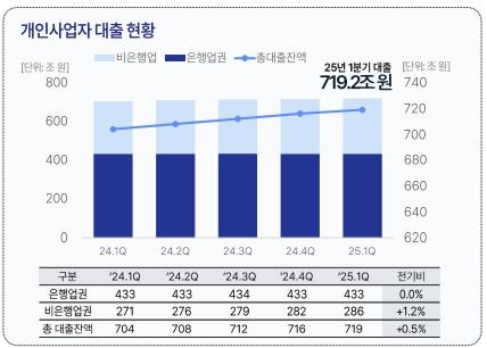 소상공인의 대출 규모도 커지고 있는 것으로 조사됐다. 한국신용데이터(KCD)의 ‘2025년 1분기 소상공인 동향’ 보고서에 따르면 1분기 말 기준 개인사업자의 대출 잔액은 약 719조원으로 1년 전(704조원)보다 15조원 증가했다.