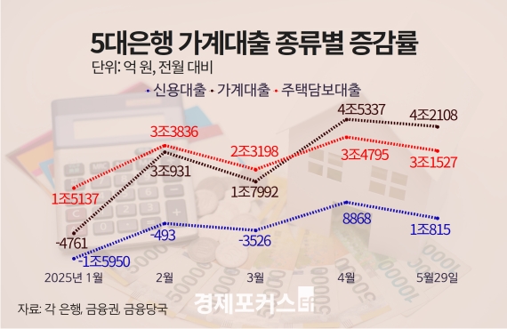 1일 금융권과 금융당국에 따르면 29일 기준 전체 금융권 가계대출 잔액은 전월 말 대비 약 6조원 증가했다. 이는 지난해 10월(6조5000억원) 이후 월간 기준 최대 증가 폭이다. 가계대출은 올해 2월(4조2000억원), 3월(4000억원), 4월(5조3000억원)에 이어 5월까지 4개월 연속 증가세를 기록 중이다.