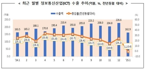 과학기술정보통신부가 13일 발표한 ‘2025년 1월 ICT 수출입 동향’에 따르면, ICT 수출은 162억9000만 달러, 수입은 134억5000만 달러를 기록했다. 이에 따라 무역수지는 28억3000만 달러 흑자로 잠정 집계됐다. 수출액은 전년 동월 대비 0.4% 감소했다.