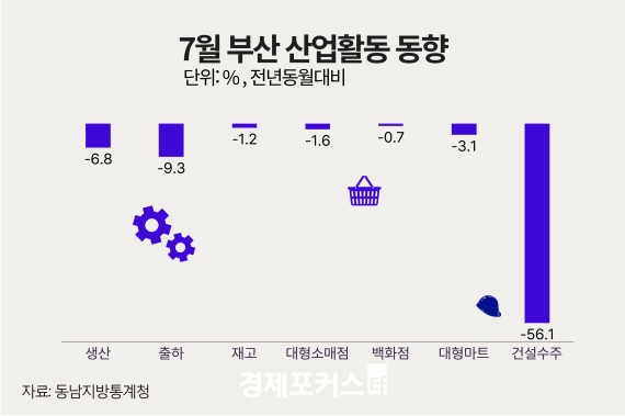 부산지역의 7월 산업활동이 전반적으로 부진한 모습을 보였다. 생산과 소비가 모두 줄어든 가운데, 건설수주도 큰 폭으로 감소하며 지난달 급증세와는 대조를 이뤘다.