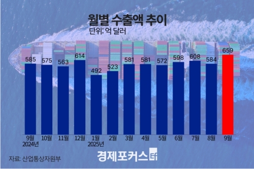 산업통상자원부가 1일 발표한 ‘9월 수출입 동향’에 따르면, 수출액은 전년 동월 대비 12.7% 증가한 659억5000만 달러로 집계됐다. 이는 2022년 3월(638억 달러) 이후 가장 높은 월간 실적이자 사상 최대 기록이다. 월간 수출은 지난 6월부터 4개월 연속 증가세를 이어갔다.