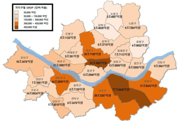 ±¸º° GRDP ±Ô¸ð´Â °­³²±¸°¡ 77Á¶9240¾ï¿øÀ¸·Î °¡Àå ÄÇ´Ù. Áß±¸(61Á¶3427¾ï¿ø), ¿µµîÆ÷±¸(44Á¶2659¾ï¿ø), ¼­Ãʱ¸(38Á¶3357¾ï¿ø) ¼øÀ¸·Î ³ªÅ¸³µ´Ù. °¡Àå ±Ô¸ð°¡ ÀÛÀº ±¸´Â 3Á¶4630¾ï ¿øÀÇ °­ºÏ±¸·Î ³ªÅ¸³µ´Ù.