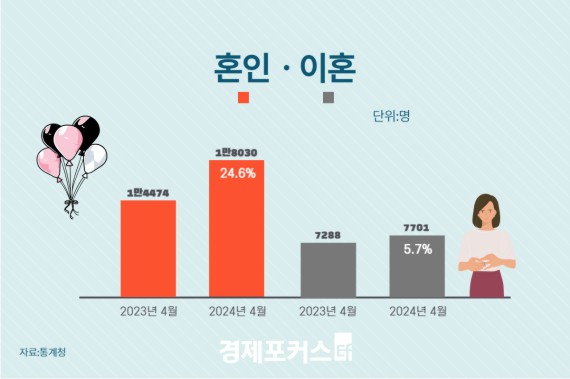 È¥ÀÎ °Ç¼ö´Â 1¸¸8039°ÇÀ» ±â·ÏÇß´Ù. ÀÛ³â 4¿ù(1¸¸4474°Ç) º¸´Ù 3565°Ç(24.6%) Áõ°¡Çß´Ù. Áö³ÇØ 4¿ù 8.4%°¡ ÁÙ¾ú´ø ±âÀúÈ¿°ú¿¡´Ù ½Å°í Àϼö°¡ ÇÏ·ç ´Ã¾î³ ¿µÇâÀ¸·Î Áõ°¡ÆøÀÌ ÄÇ´Ù.