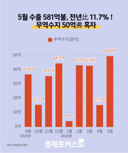 1ÀÏ »ê¾÷Åë»óÀÚ¿øºÎ°¡ ¹ßÇ¥ÇÑ 5¿ù ¼öÃâÀÔµ¿Çâ¿¡ µû¸£¸é Áö³´Þ ¼öÃâÀº Àü³âµ¿¿ù´ëºñ 11.7% Áõ°¡ÇÑ 581¾ï5000¸¸´Þ·¯¸¦ ±â·ÏÇß´Ù. ¼öÀÔÀº 532¾ï ´Þ·¯·Î Àü³âº¸´Ù 2.0% °¨¼ÒÇß´Ù. 5¿ù ¹«¿ª¼öÁö´Â 50¾ï´Þ·¯ ÈæÀÚ¸¦ ±â·ÏÇØ Àü¿ù(15¾ï´Þ·¯)º¸´Ù 3¹è ÀÌ»ó ´Ã¾ú´Ù.