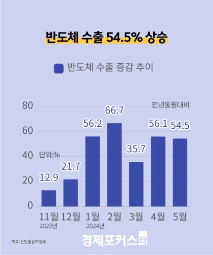 ÃÖ´ë ¼öÃâ ǰ¸ñÀÎ ¹ÝµµÃ¼ ¼öÃâÀº 54.5% Áõ°¡ÇÑ 113¾ï8000¸¸ ´Þ·¯·Î 7°³¿ù ¿¬¼Ó Ç÷¯½º È帧ÀÌ´Ù. µð½ºÇ÷¹ÀÌ ¼öÃâÀº 15.8% Áõ°¡ÇÑ 16¾ï3000¸¸ ´Þ·¯·Î ¿ÃÇØ °¡Àå ³ôÀº ½ÇÀûÀ» ±â·ÏÇß´Ù. ¹ÝµµÃ¼¿Í µð½ºÇ÷¹À̸¦ Æ÷ÇÔÇÑ 4´ë Á¤º¸±â¼ú(IT) Àü ǰ¸ñ(¹ÝµµÃ¼·µð½ºÇ÷¹ÀÌ·ÄÄÇ»ÅÍ·¹«¼±Åë½Å±â±â) ¼öÃâ Áõ°¡À²Àº 44.1%·Î ¿ª½Ã 7°³¿ù ¿¬¼Ó Áõ°¡Çß´Ù. ÀÚµ¿Â÷ ¼öÃâÀº 64¾ï9000¸¸´Þ·¯·Î Àü³âº¸´Ù 4.8% Áõ°¡ÇØ 2°³¿ù ¿¬¼Ó »ó½Â¼¼¸¦ À̾´Ù.