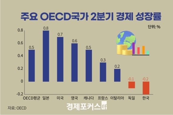 30ÀÏ OECD Åë°è¿¡ µû¸£¸é Çѱ¹ÀÇ 2ºÐ±â °æÁ¦¼ºÀå·üÀº OECD 33°³ ȸ¿ø±¹ Áß¿¡¼ 30À§¿¡ ±×ÃÆ´Ù. 2ºÐ±â °æÁ¦¼ºÀå·üÀÌ ¿ì¸®º¸´Ù ³·Àº ³ª¶ó´Â ¶óÆ®ºñ¾Æ(-1.1%) ½º¿þµ§(-0.8%)°ú Ä¥·¹(-0.6%)»ÓÀ̾ú´Ù.