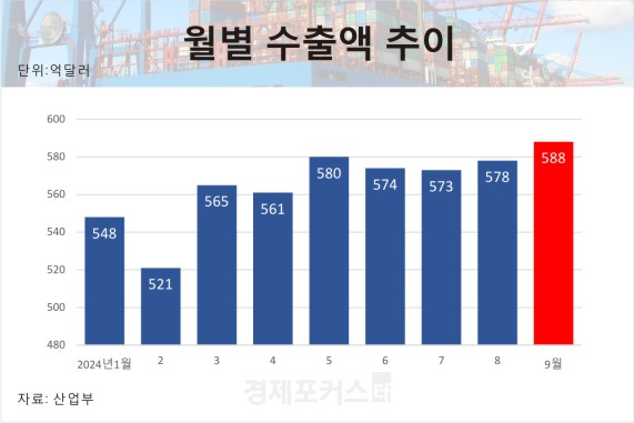 9¿ù ¼öÃâÀÌ Áö³ÇØ °°Àº ±â°£º¸´Ù 7.5% Áõ°¡ÇÑ 587¾ï7000¸¸ ´Þ·¯¸¦ ±â·ÏÇϸç 12°³¿ù° Ç÷¯½º¸¦ À̾´Ù.