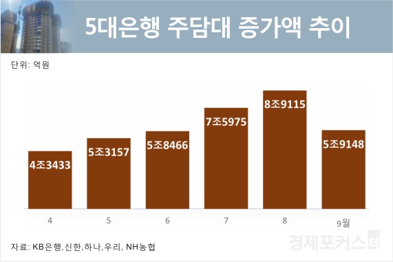 2ÀÏ ±ÝÀ¶±Ç¿¡ µû¸£¸é 5´ë ÀºÇà(KB±¹¹Î·½ÅÇÑ·Çϳª·¿ì¸®·NH³óÇù)ÀÇ 9¿ù ¸» °¡°è´ëÃâ Àܾ×Àº 730Á¶9671¾ï¿øÀ¸·Î 8¿ù ¸» 725Á¶3642¾ï¿øº¸´Ù 5Á¶6029¾ï¿ø Áõ°¡Çß´Ù.