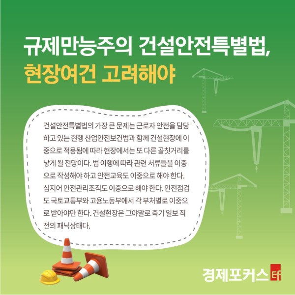 °Ç¼³¾ÈÀüƯº°¹ýÀÇ °¡Àå Å« ¹®Á¦´Â ±Ù·ÎÀÚ ¾ÈÀüÀ» ´ã´çÇϰí ÀÖ´Â ÇöÇà »ê¾÷¾ÈÀüº¸°Ç¹ý°ú ÇÔ²² °Ç¼³ÇöÀå¿¡ ÀÌÁßÀ¸·Î Àû¿ëµÊ¿¡ µû¶ó ÇöÀå¿¡¼­´Â ¶Ç ´Ù¸¥ °ñÄ©°Å¸®¸¦ ³º°Ô µÉ Àü¸ÁÀÌ´Ù. ¹ý ÀÌÇà¿¡ µû¶ó °ü·Ã ¼­·ùµéÀ» ÀÌÁßÀ¸·Î ÀÛ¼ºÇØ¾ß ÇÏ°í ¾ÈÀü±³À°µµ ÀÌÁßÀ¸·Î ÇØ¾ß ÇÑ´Ù. ½ÉÁö¾î ¾ÈÀü°ü¸®Á¶Á÷µµ ÀÌÁßÀ¸·Î ÇØ¾ß ÇÑ´Ù. ¾ÈÀüÁ¡°Ëµµ ±¹Åä±³ÅëºÎ¿Í °í¿ë³ëµ¿ºÎ¿¡¼­ °¢ ºÎóº°·Î ÀÌÁßÀ¸·Î ¹Þ¾Æ¾ß¸¸ ÇÑ´Ù. °Ç¼³ÇöÀåÀº ±×¾ß¸»·Î Á×±â ÀϺ¸ Á÷ÀüÀÇ ÆÐ´Ð»óÅ´Ù.