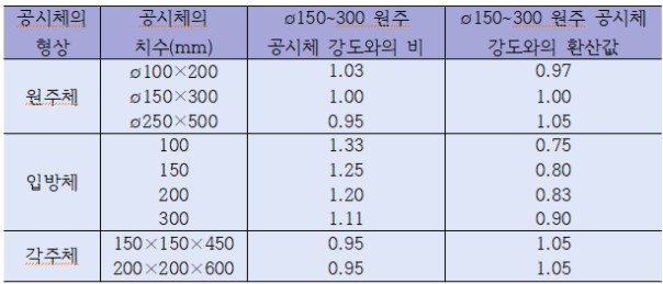 Ç¥¿¡¼­ º¸´Â ¹Ù¿Í °°ÀÌ ø150˟300 ¿øÁÖ °ø½Ãü¸¦ ±âÁØÀ¸·Î ÇÒ °æ¿ì 150 mm ÀÔ¹æÃ¼´Â 25 % Áõ°¡µÇ´Â 1.25, 150 mm °¢ÁÖü´Â 5 % ÀúÇϵǴ 0.95¸¦ ³ªÅ¸³½´Ù. ÀÌÁß ÀÔ¹æÃ¼ÀÇ °æ¿ì´Â ³ôÀÌ¿Í Á÷°æÀÇ ºñ(H/D)°¡ ¿øÁÖüÀÇ 2º¸´Ù ÀÛÀº 1·Î¼­ ºí¸®µù µî Àç·áºÐ¸® ¹× Á±¼ÀÇ ¿µÇâÀ» Àû°Ô ¹Þ¾Æ Å« °­µµ¸¦ ¹ßÈÖÇÒ ¿äÀÎÀÎ ¹× ¿øÁÖ 150 mmº¸´Ù »ç°¢Çü 150 mm´Â ´Ü¸éÀûÀÌ Ä¿¼­ °­µµ°¡ Àû°Ô Æò°¡µÉ Ä¡¼öÈ¿°úÀÇ ¿äÀÎ µî º¹ÇÕ Áß H/DÀÇ ¿µÇâÀ» Å©°Ô ¹Þ¾Æ 25 %ÀÇ Å« °­µµ¸¦ ³ªÅ¸³½ °ÍÀÌ´Ù. µû¶ó¼­ Áß±¹ µî ÀÔ¹æÃ¼¸¦ »ç¿ëÇÏ´Â ±¹°¡ÀÇ °ø½Ãü·Î ÃøÁ¤µÈ °­µµ °ªÀ¸·Î, ÀÏ·Ê·Î 40 MPa °­µµ´Â ¿ì¸®³ª¶óÀÇ °­µµ °ªÀ¸·Î ȯ»êÇϸé 40˟0.8=32·Î 32 MPa°¡ µÇ´Â °ÍÀÌ´Ù.