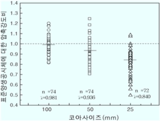 Ç¥ 1Áß¿¡´Â µ¿ÀÏÇÑ ´àÀº²Ã ¸ð¾ç¿¡¼­ Å©±â°¡ Ä¿Áö°Å³ª ÀÛ¾ÆÁö´Â °æ¿ìÀÇ ¿µÇâ¿¡ ´ëÇÏ¿©µµ ³ªÅ¸³½ °ÍÀÌ´Ù. ÀÏ·Ê·Î H/D°¡ 2ÀÎ ¿øÁÖ °ø½ÃüÀÇ °æ¿ì Áö¸§ÀÌ 150mmÀÎ ø150À» 1·Î ÇÏ¸é ø100Àº 3 % Å« 1.03, ø250Àº 5 % ÀÛÀº 0.95¸¦ ³ªÅ¸³½´Ù. ÀÌ´Â ½ÃÇè±â ÀçÇÏÆÇ°ú ÄÜÅ©¸®Æ® °ø½Ãü »çÀÌÀÇ ¸¶Âû(¸¶Âû°è¼ö 0.4)ÀÇ ¿µÇâÀ¸·Î ÄÜÅ©¸®Æ®¿¡¼­ ¹ß»ýÇÏ´Â ºí¸®µùÀÇ ¿µÇâ(Çü»óÀÌ Å¬¼ö·Ï ³ôÀ̰¡ ³ô¾Æ ºí¸®µùÀÌ »óºÎ ÂÊ¿¡ ¸¹ÀÌ ¹ß»ýÇÏ¿© °­µµ°¡ ÀúÇϵÊ)À» Å©°Ô ¹Þ¾Æ °­µµ°¡ ÀÛ¾ÆÁú ¼ö ÀÖ´Â ¿äÀÎ ¹× Å©±â°¡ Å©¸é °áÇÔÀÌ ¹ß»ýÇÒ È®·üÀÌ Å« °Í µîÀÇ º¹ÇÕ¿äÀÎÀ¸·Î °ø½ÃüÀÇ Å©±â°¡ Ŭ¼ö·Ï °­µµ°¡ ÀÛ°Ô ³ªÅ¸³ª´Â °ÍÀÌ´Ù. ´Ù¸¥ ¸»·Î´Â ½ÃÇèü°¡ ÀÛÀ»¼ö·Ï ¾ÐÃà°­µµ´Â Å« °ÍÀ¸·Î Æò°¡µÇ´Âµ¥, À̰ÍÀ» °ø½ÃüÀÇ Å©±âÈ¿°ú(Size effect)¶ó°íµµ ÇÑ´Ù.