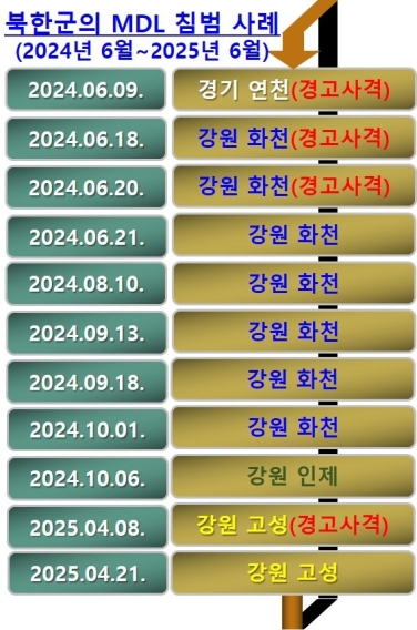 ÇÕµ¿Âü¸ðº»ºÎ(ÀÌÇÏ ÇÕÂü)°¡ 8ÀÏ ±¹È¸ ±¹¹æÀ§¿øÈ¸ °­´ë½Ä ÀÇ¿ø(±¹¹ÎÀÇÈû)½Ç¿¡ Á¦ÃâÇÑ ÀÚ·á¿¡ ÀÇÇϸé, 2008³âºÎÅÍ ÃÖ±Ù¿¡ À̸£±â±îÁö 17³â°£ ºÏÇѱºÀÌ ºñ¹«ÀåÁö´ë(ÀÌÇÏ DMZ) ³»(Ò®)ÀÇ MDL ÀÏ´ë¿¡¼­ Áö»ó µµ¹ßÀ» ÀÚÇàÇÑ °Ç¼ö´Â ÃÑ 25°ÇÀÌ´Ù.
