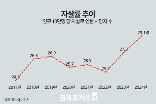 ÀÚ»ì·üÀº »ó½Â¼¼¸¦ º¸¿´´Ù. 2024³â ÀÚ»ì·üÀº Àα¸ 10¸¸ ¸í´ç 29.1¸íÀ¸·Î Àü³âº¸´Ù 1.8¸í Áõ°¡ÇØ 2³â ¿¬¼Ó ´Ã¾ú´Ù. ÀÌ´Â ¿ª´ë ÃÖ°íÄ¡¿´´ø 2011³â(31.7¸í) ÀÌÈÄ °¡Àå ³ôÀº ¼öÁØÀÌ´Ù. ¼ºº°·Î´Â ³²ÀÚ°¡ 41.8¸íÀ¸·Î ¿©ÀÚ(16.6¸í)ÀÇ µÎ ¹è ÀÌ»óÀ̾ú´Ù.