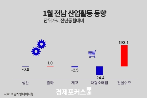 ¿ÃÇØ 1¿ù ±¤ÁÖ¿Í Àü³² Áö¿ª »ê¾÷Ȱµ¿Àº »ý»ê°ú ¼Òºñ, °Ç¼³¼öÁÖ¿¡¼ Áö¿ªº°·Î Â÷À̸¦ º¸¿´´Ù.