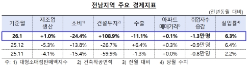 ±¤ÁÖ´Â Á¦Á¶¾÷ »ý»ê°ú ¼öÃâÀ» Áß½ÉÀ¸·Î Áö¿ª°æ±â°¡ ȸº¹ È帧À» º¸ÀÎ ¹Ý¸é, Àü³²Àº ¼Òºñ¿Í ¼öÃâ, °í¿ë µîÀÌ °¨¼ÒÇϸç Àü¹ÝÀûÀ¸·Î ºÎÁøÇÑ ¸ð½ÀÀ» ³ªÅ¸³Â´Ù.