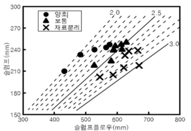 ÁÖ¾îÁø Àç·á ¹× ¹èÇÕ¿¡ µû¶ó ¿¬±¸¸¦ ÁøÇàÇÏ¿´´Âµ¥, µ¿ÇØ ½ÇÇ迬±¸°¡ ¸ÞÀÎÀÌ´Ù º¸´Ï À¯µ¿¼ºÀÇ °æ¿ì´Â ÁÖ¾îÁø °ªÀÎ ½½·³ÇÁ Ç÷Π600 ± 100 mm¿¡ °ø±â·® 4.5 ± 1.5 %¿¡ ¸ÂÃß´Â Á¤µµÀ̰í, ±× ÀÌÀüºÎÅÍ ½Ç½ÃÇÏ´ø ½½·³ÇÁ ½ÃÇèÀº ÇÏÁö ¾Ê´Â °ÍÀ̾ú´Ù. ¹°·Ð Àç·áºÐ¸® Á¤µµ´Â À°¾ÈÀ¸·Î Áß¾Ó¿¡ ±½Àº°ñÀç°¡ ¸ðÀ̰ųª, °¡ÀåÀÚ¸®¿¡ ½Ã¸àÆ® ÆäÀ̽ºÆ®ÀÇ À¯ÃâÀÌ ¾øµµ·Ï ÇÏ´Â °ÍÀÌ ÀüºÎ¿´´Ù. ±×·¸Áö¸¸ À°¾È °üÂû·Î Àç·áºÐ¸®¸¦ Æò°¡ÇÑ´Ù´Â °ÍÀº Àü¹®°¡¶ó¸é ±×·±´ë·Î ¾Ë ¼ö ÀÖ°ÚÁö¸¸ ¾î´À Á¤µµÀÇ Á¡¼ºÀ¸·Î Àç·áºÐ¸® ÀúÇ×¼ºÀ» °®°í ÀÖ´ÂÁö Á¤·®È­µÈ ¼ýÀڷΠǥ±âÇϱâ´Â ºÒ°¡´ÉÇÑ °ÍÀ̾ú´Ù.