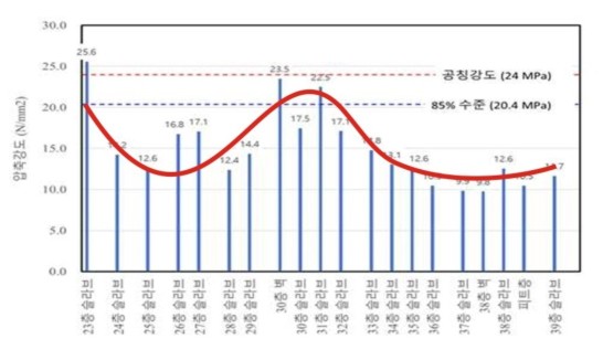 ±¸Ã¼ÀûÀ¸·Î ¹Ì´Þ µÈ ¾ç»óÀº Á÷Á¢ Á¶»ç¿¡ Âü¿©ÇÏÁö ¾Ê¾Æ ¿ÀÂ÷°¡ ÀÖÀ» ¼ö ÀÖ°ÚÁö¸¸, 39Ãþ Pit ÃþÀÌ 1¿ù 11ÀÏ Å¸¼³ µÇ¾úÀ½¿¡ ±× ÀÌÇÏ ¸î °³ ÃþÀº ±×¸² 1°ú °°ÀÌ ¿ª Æ÷¹°¼± ¸ð¾çÀÌ µÇ¾î 10MPa ÀÌ»ó °µµ ºÎÁ· Çö»óÀÌ ³ªÅ¸³ª°í Àִµ¥, ÀÌ´Â ³·Àº ¿Ü±â¿Â ÀÓ¿¡µµ ºÒ±¸ÇÏ°í ±â¿Âº¸Á¤°µµ¸¦ ¼³°èÇÏÁöµµ ¾Ê¾Ò°í, ±×¿¡ µû¶ó ½Ã°øµµ µÇÁö ¾Ê¾ÒÀ½¿¡ ±âÀÎÇÑ °ÍÀÌ´Ù.