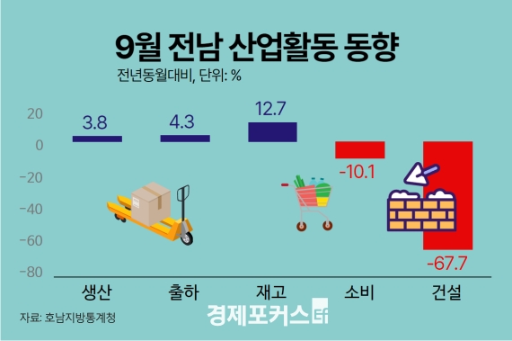 9¿ù ±¤ÁÖ Áö¿ª ±¤°ø¾÷ »ý»êÀÌ Àü³â °°Àº ±â°£ ´ëºñ Áõ°¡¼¼·Î ÀüȯµÆÀ¸³ª ¼Òºñ¿Í °Ç¼³Àº °¨¼Ò¼¼°¡ °è¼ÓµÆ´Ù. Àü³²Àº ±¤°ø¾÷ »ý»êÀº Áõ°¡ÇßÀ¸³ª ¼Òºñ¿Í °Ç¼³Àº °¨¼Ò¼¼°¡ À̾îÁ³´Ù.