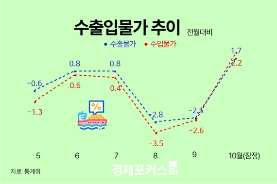 10¿ù ¼ø»óǰ±³¿ªÁ¶°ÇÁö¼ö´Â Àü³â µ¿¿ù ´ëºñ 3.9% »ó½ÂÇß´Ù. ¼öÀÔ°¡°ÝÀÌ 3.4% Ç϶ôÇÑ ¹Ý¸é ¼öÃâ°¡°ÝÀº 0.3% »ó½ÂÇÑ µ¥ µû¸¥ °ÍÀÌ´Ù.