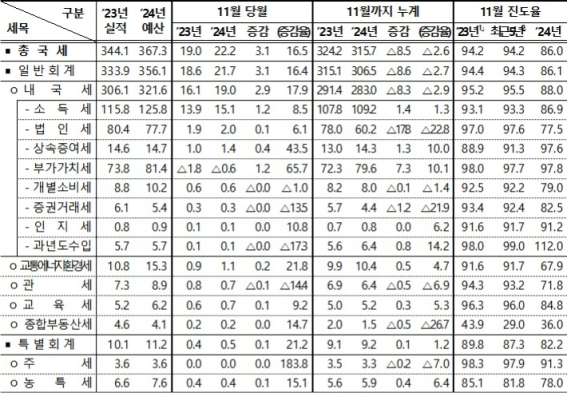±âȹÀçÁ¤ºÎ°¡ 31ÀÏ ¹ßÇ¥ÇÑ '24³â 11¿ù ±¹¼¼¼öÀÔ ÇöȲ'¿¡ µû¸£¸é 11¿ù ±¹¼¼¼öÀÔÀº 22Á¶2000¾ï¿øÀ¸·Î 1³â Àüº¸´Ù 3Á¶1000¾ï¿ø ´Ã¾ú´Ù.