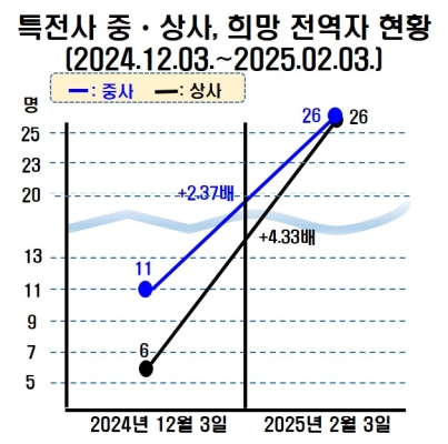Áö³ 10ÀÏ ±¹È¸ ±¹¹æÀ§¿øÈ¸ ¼Ò¼ÓÀÎ ±¹¹ÎÀÇÈû À¯¿ë¿ø ÀÇ¿ø½ÇÀÌ °ø°³ÇÑ ‘ÃÖ±Ù 5³â ƯÁ¤ ±â°£ ³» À°±º ƯÀü»ç °è±Þº° Èñ¸Á Àü¿ª’ ÀÚ·á¿¡ ÀÇÇϸé, Áö³ÇØ 12¿ù 3ÀϺÎÅÍ À̹ø ´Þ 3ÀϱîÁö µÎ ´Þ°£ ƯÀü»ç¿¡ ±Ù¹«ÇÏ´ø Áß»çÀÇ Èñ¸Á Àü¿ª ½ÅûÀº Áö³ÇØ °°Àº ±â°£ 11¸í¿¡¼ 26¸íÀ¸·Î ¾à 2.37¹è, »ó»ç´Â 6¸í¿¡¼ 26¸íÀ¸·Î ¾à 4.33¹è°¡ ´Ã¾ú´Ù.