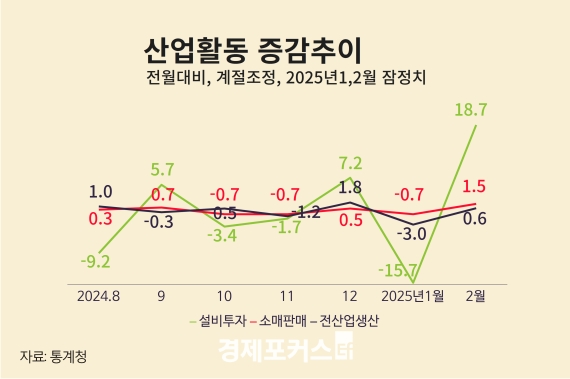 ÃÖ±Ù »ê¾÷ÁöÇ¥´Â Áõ°¡¿Í °¨¼Ò¸¦ ¹Ýº¹ÇÏ¸ç ºÒ¾ÈÇÑ È帧À» À̾°í ÀÖ´Ù. 11¿ù ÀÌÈÄ ¡â11¿ù(»ý»ê -1.2%, ¼Òºñ -1.7%, ÅõÀÚ -1.7%) ¡â12¿ù(»ý»ê 1.8%, ¼Òºñ 1.3%, ÅõÀÚ 7.2%) ¡â1¿ù(»ý»ê -3.0%, ¼Òºñ -0.9%, ÅõÀÚ -15.7%) ¡â2¿ù(»ý»ê 0.6%, ¼Òºñ 1.5%, ÅõÀÚ 18.7%)·Î ÁöÇ¥ º¯µ¿¼ºÀÌ Å©´Ù.