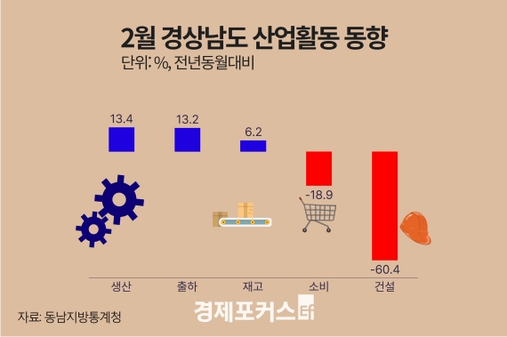 µ¿³²Áö¹æÅë°èûÀÌ ¹ßÇ¥ÇÑ ‘2¿ù °æ»ó³²µµ »ê¾÷Ȱµ¿µ¿Çâ’¿¡ µû¸£¸é, °æ³²ÀÇ ±¤°ø¾÷ »ý»êÁö¼ö´Â Àü³â µ¿¿ù ´ëºñ 13.4% »ó½ÂÇß´Ù. ƯÈ÷ ±Ý¼Ó°¡°ø(80.5%)°ú ÀÚµ¿Â÷(13.7%) ºÎ¹®¿¡¼ »ý»êÀÌ Å©°Ô ´Ã¾úÀ¸¸ç, ÃâÇϵµ °¢°¢ 73.2%, 14.8% Áõ°¡ÇÏ¸é¼ Àüü ÃâÇÏ´Â 13.2% ¿Ã¶ú´Ù.