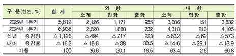 µ¿ÇØ¡¤¹¬È£Ç× 1ºÐ±â ¹°µ¿·® 581¸¸t¡¦Àü³â ´ëºñ 16.2% °¨¼Ò