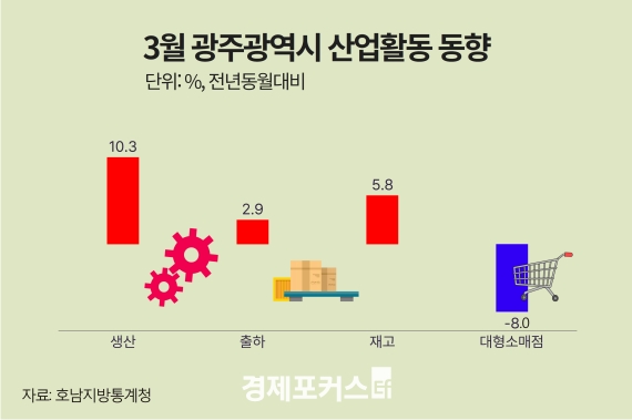 30ÀÏ È£³²Áö¹æÅë°èûÀÌ ¹ßÇ¥ÇÑ ‘3¿ù ±¤ÁÖ·Àü³² »ê¾÷Ȱµ¿µ¿Çâ’¿¡ µû¸£¸é, ±¤ÁÖÀÇ ±¤°ø¾÷ »ý»êÁö¼ö´Â 131.4·Î Áö³­ÇØ °°Àº ´Þº¸´Ù 10.3% Áõ°¡Çß´Ù. Àü±âÀåºñ(38.2%), ´ã¹è(22.5%), ÀÚµ¿Â÷(8.0%) µîÀÇ ¾÷Á¾ÀÌ Áõ°¡¼¼¸¦ °ßÀÎÇÑ ¹Ý¸é, ½Ä·áǰ(-15.5%), ¼¶À¯Á¦Ç°(-19.5%), À½·á(-7.8%) µîÀº °¨¼ÒÇß´Ù.