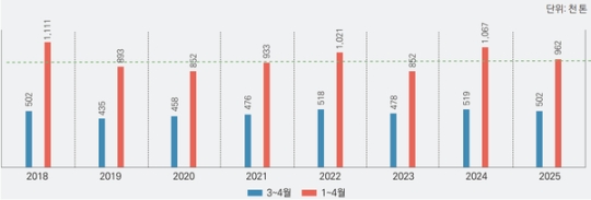 Çѱ¹ÀÇ ´ë¹Ì ö°­ ¼öÃâ ½ÇÀû ÃßÀÌ ºñ±³(2018~2025). ÀÚ·á=»ê¾÷¿¬±¸¿ø