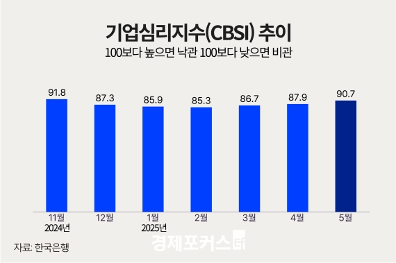 Çѱ¹ÀºÇàÀÌ 28ÀÏ ¹ßÇ¥ÇÑ ‘2025³â 5¿ù ±â¾÷°æ±âÁ¶»ç °á°ú ¹× °æÁ¦½É¸®Áö¼ö’¿¡ µû¸£¸é, ÀÌ´Þ Àü»ê¾÷ ±â¾÷½É¸®Áö¼ö(CBSI)´Â 90.7·Î Àü¿ù ´ëºñ 2.8Æ÷ÀÎÆ®(p) »ó½ÂÇß´Ù. Áö³­ÇØ 11¿ù ÀÌÈÄ 4°³¿ù ¿¬¼Ó Ç϶ô¼¼¸¦ º¸ÀÌ´Ù Áö³­ 3¿ù ¹ÝµîÇÑ ÈÄ 3°³¿ù ¿¬¼Ó »ó½Â¼¼´Ù. ¿À¸§ÆøÀº Áö³­ 2023³â 5¿ù(4.4p »ó½Â) ÀÌÈÄ 2³â ¸¸¿¡ °¡Àå ÄÇ´Ù.