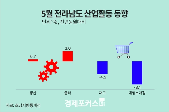 ±¤ÁÖ·Àü³²Áö¿ªÀÇ Áö³ 5¿ù ±¤°ø¾÷ »ý»ê°ú ÃâÇÏ Áö¼ö´Â Àü³â µ¿¿ù ´ëºñ ¸ðµÎ Áõ°¡ÇÑ ¹Ý¸é, ¼Òºñ ºÎ¹®ÀÎ ´ëÇü¼Ò¸ÅÁ¡ ÆÇ¸Å¾× Áö¼ö´Â µÎ Áö¿ª ¸ðµÎ °¨¼ÒÇÑ °ÍÀ¸·Î ³ªÅ¸³µ´Ù.