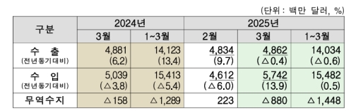 15ÀÏ ÀÎõº»ºÎ¼¼°ü¿¡ µû¸£¸é 3¿ù ÀÎõ ¼öÃâÀº Àü³â µ¿¿ù ´ëºñ 0.4% ÁÙ¾îµç 48¾ï6000¸¸ ´Þ·¯·Î Áý°èµÆ´Ù. 2¿ù 9.7% Áõ°¡¿¡¼ °¨¼Ò¼¼·Î µ¹¾Æ¼± °ÍÀÌ´Ù. ¼öÀÔÀº 57¾ï4000¸¸ ´Þ·¯·Î 13.9% ´Ã¸ç 3°³¿ù ¸¸¿¡ Áõ°¡¼¼·Î ÀüȯµÆ´Ù.