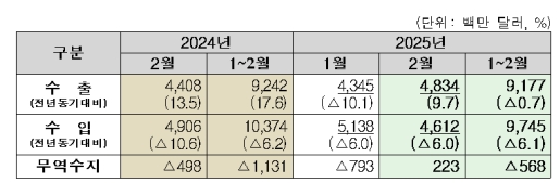 17ÀÏ ÀÎõº»ºÎ¼¼°ü¿¡ µû¸£¸é 2¿ù ¼öÃâÀº Àü³â µ¿¿ù ´ëºñ 9.7% Áõ°¡ÇÑ 48¾ï3000¸¸ ´Þ·¯, ¼öÀÔÀº 6.0% °¨¼ÒÇÑ 46¾ï1000¸¸ ´Þ·¯·Î Áý°èµÆ´Ù. 1¿ù ¼öÃâÀÌ 10.1% °¨¼ÒÇß´ø °Í°ú ´Þ¸® ¹Ýµî¿¡ ¼º°øÇÑ °ÍÀÌ´Ù.