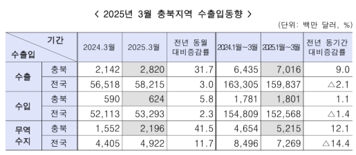 15ÀÏ Ã»ÁÖ¼¼°ü¿¡ µû¸£¸é 2025³â 3¿ù ÃæºÏÁö¿ªÀÇ ¼öÃâÀº 28¾ï2000¸¸ ´Þ·¯, ¼öÀÔÀº 6¾ï2400¸¸ ´Þ·¯·Î ¹«¿ª¼öÁö 21¾ï9600¸¸ ´Þ·¯ ÈæÀÚ¸¦ ±â·ÏÇß´Ù. ÀÌ´Â Áö³ÇØ °°Àº ´Þº¸´Ù 30% ´Ã¾î³ ¼öÄ¡·Î, ¹«¿ª¼öÁö´Â Àü³â µ¿¿ù ´ëºñ 41.5% Áõ°¡Çß´Ù.