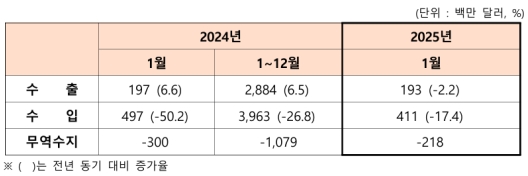 ¼öÀÔ¾×Àº 4¾ï1069¸¸ ´Þ·¯·Î Àü³âº¸´Ù 17.4% °¨¼ÒÇß´Ù. ÁÖ¿ä ǰ¸ñº°·Î´Â õ¿¬°¡½º(2¾ï7800¸¸ ´Þ·¯, -20.3%), À¯¿¬Åº(4543¸¸ ´Þ·¯, -14.2%), ÀÚµ¿Â÷ºÎǰ(310¸¸ ´Þ·¯, -7.9%)µîÀÌ ÁÙ¾ú°í, °Ô(1822¸¸ ´Þ·¯, 90.6%), »ç·á(374¸¸ ´Þ·¯, 4.9%)µîÀº ´Ã¾ú´Ù.