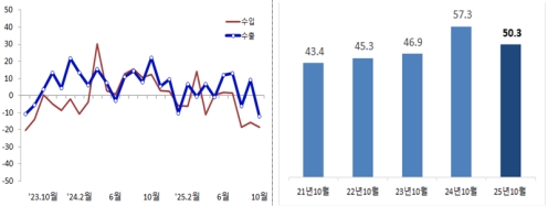 °ü¼¼Ã» ÀÎõº»ºÎ¼¼°üÀÌ 17ÀÏ ¹ßÇ¥ÇÑ ÀÚ·á¿¡ µû¸£¸é, 10¿ù ÀÎõ ¼öÃâÀº 50¾ï3000¸¸ ´Þ·¯·Î Àü³â µ¿¿ù ´ëºñ 12.1% °¨¼ÒÇϸç 1°³¿ù ¸¸¿¡ ´Ù½Ã °¨¼Ò·Î ÀüȯµÆ°í, ¼öÀÔÀº 18.6% ÁÙ¾î 47¾ï3000¸¸ ´Þ·¯¸¦ ±â·ÏÇß´Ù. ÀÌ¿¡ µû¶ó ¹«¿ª¼öÁö´Â 3¾ï1000¸¸ ´Þ·¯ ÈæÀÚ¸¦ ³ªÅ¸³Â´Ù. ¼öÀÔÀº 3°³¿ù ¿¬¼Ó µÎ ÀÚ¸´¼ö °¨¼Ò¼¼¸¦ À̾´Ù.